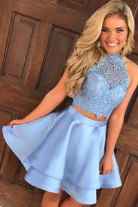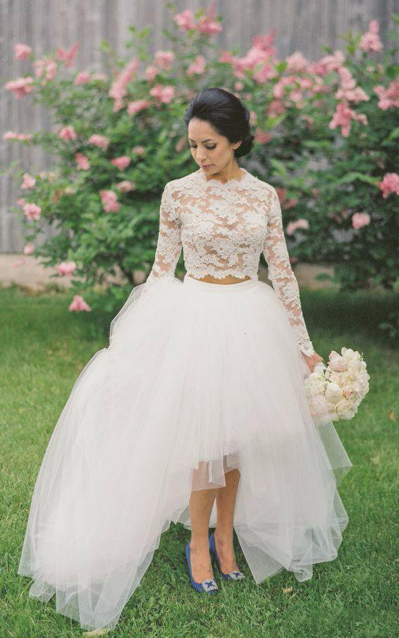 A-Line Short High Neck Jewel Long Sleeve Bell Zipper Tulle Lace Dress-713447