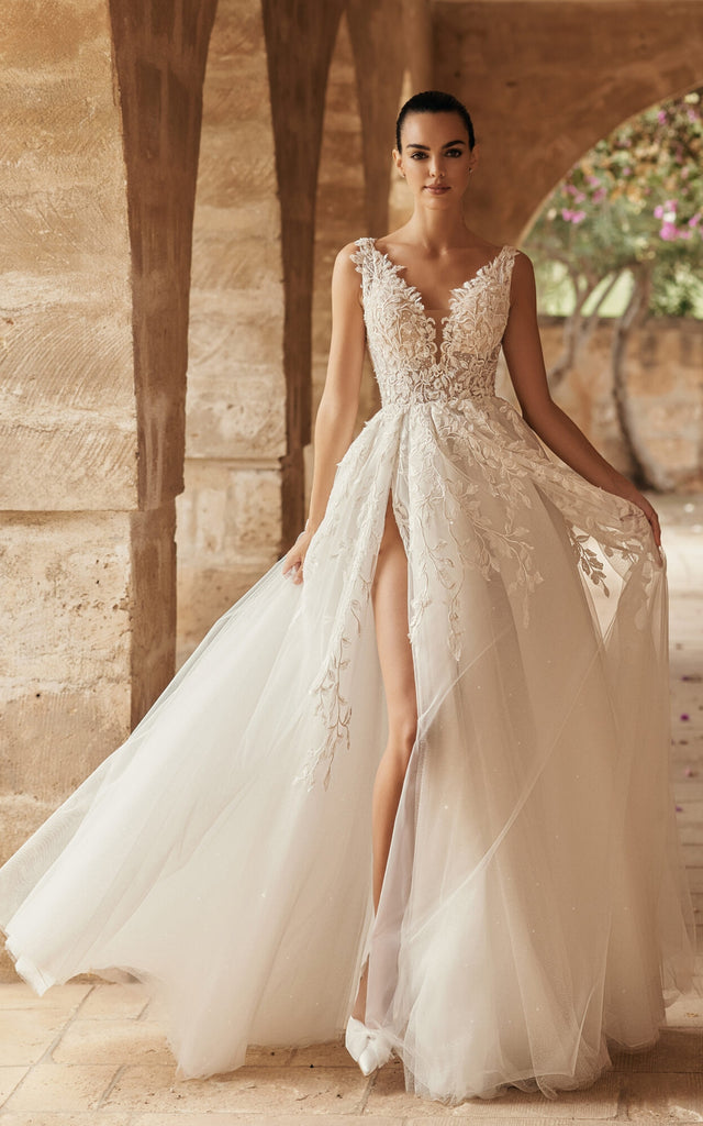 Sexy Floral Beach A-Line Boho Lace Ball Gown Wedding Dress Romantic Princess Garden Plunging Button Back Gown with Split Front