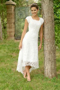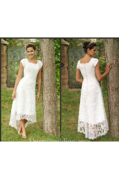 High Low U Neck Cap Sleeves Modest Elegant Lace Wedding Dress-715362
