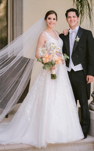 Casual Ball Gown V-neck Tulle Sweep Train Wedding Dress with Appliques-716404