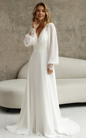 Ideal for a springtime soiree, a garden ceremony, or a fairy-tale forest nuptial, this dress’s natural charm is versatile across various settings. Its embroidered elegance lays the groundwork for a bride’s personal flair, inviting her to accessorize with vintage-inspired jewelry or a floral crown.