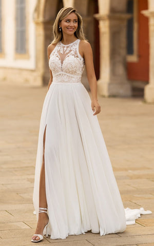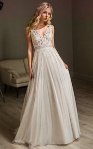 Ideal for a springtime soiree, a garden ceremony, or a fairy-tale forest nuptial, this dress’s natural charm is versatile across various settings. Its embroidered elegance lays the groundwork for a bride’s personal flair, inviting her to accessorize with vintage-inspired jewelry or a floral crown.