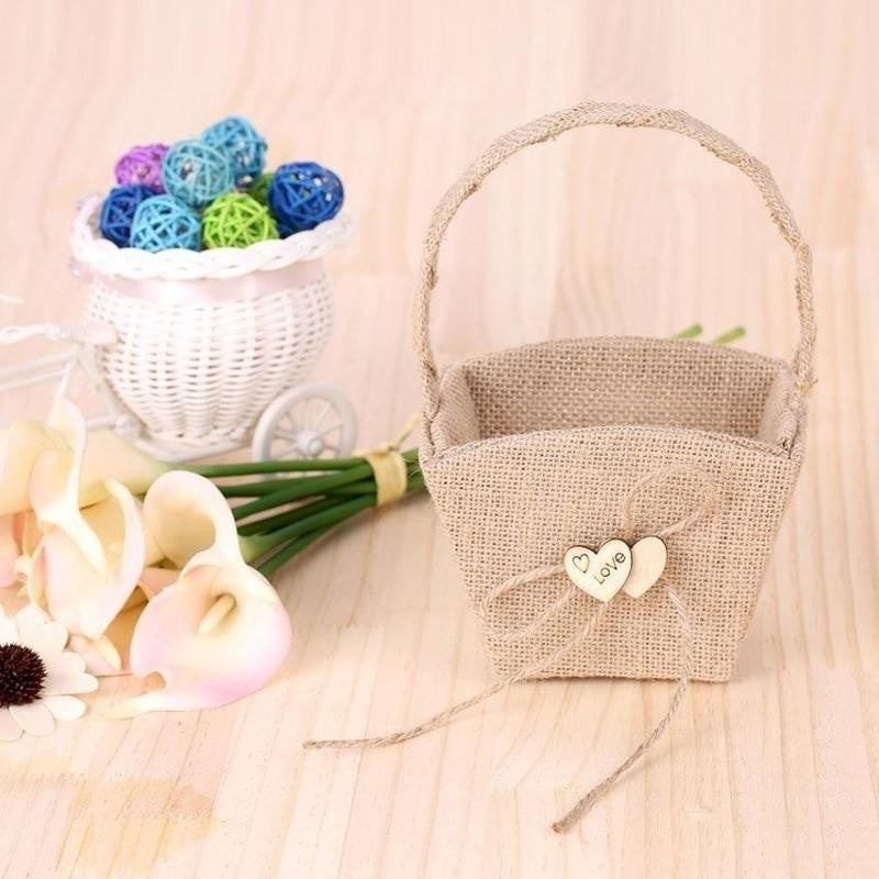- The body of the basket is covered in burlap and accented by two wooden love heart and hemp rope bowknot.