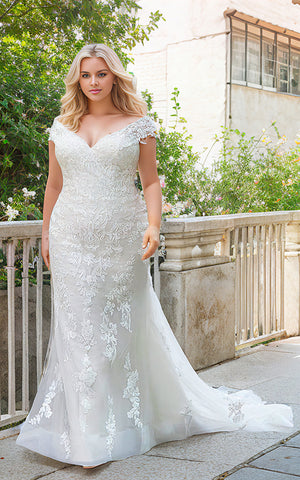 Lace off-the-shoulder wedding dresses beautifully blend timeless romance with feminine allure. Designed to highlight the collarbones and shoulders while offering delicate coverage, these gowns are perfect for brides seeking a graceful, elegant look with a touch of sensuality.
