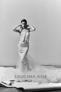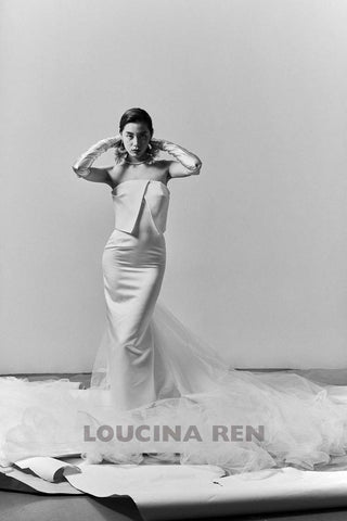 Loucina Ren attended Cours Florent where she studied acting. Later she became a theatre actress but she soon found her passion in design when she designed and made a dress for her character in a play. She started her own studio in 2015 and created her brand Doneto. Her designs are architectural and feminine, soft and crazy; which always include a touch of drama. She loves the combination of luxurious satins, flowing silk organzas and airy tulle, which together create not just a dress, but an expression of love.