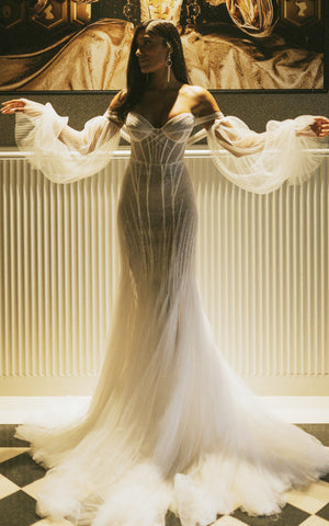 The mermaid-style wedding dress is a stunning choice for brides who want to showcase their curves with a glamorous, figure-hugging silhouette. This dramatic style is known for its form-fitting bodice that flares out at or below the knee, creating a mesmerizing effect as it gracefully cascades to the floor.