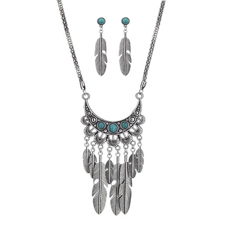 Fashion Design Boho Style Feather Tassel Handmade Necklace And Earrings Women Alloy Silver Jewelry Set