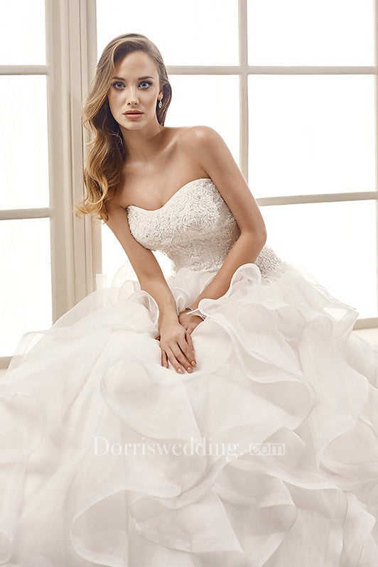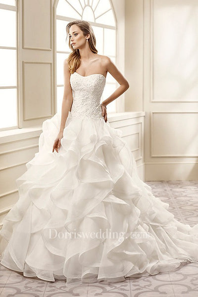 A-Line Appliqued Strapless Long Organza Wedding Dress With Cascading Ruffles And Court Train