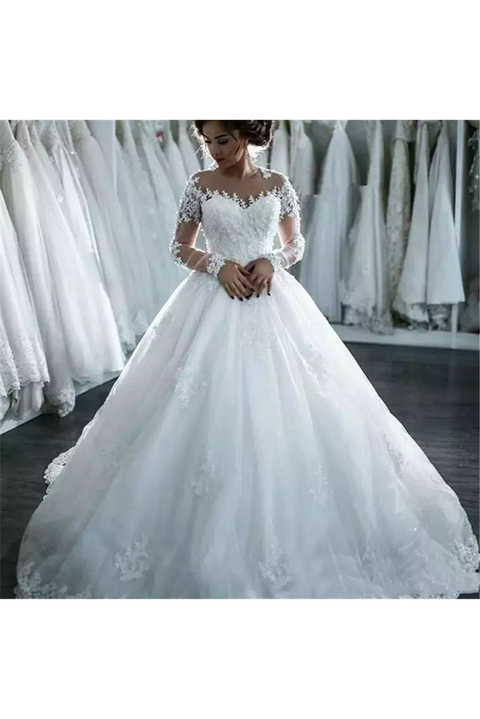 A-Line Ball Gown Jewel Sleeveless Lace Tulle Wedding Dress-715570