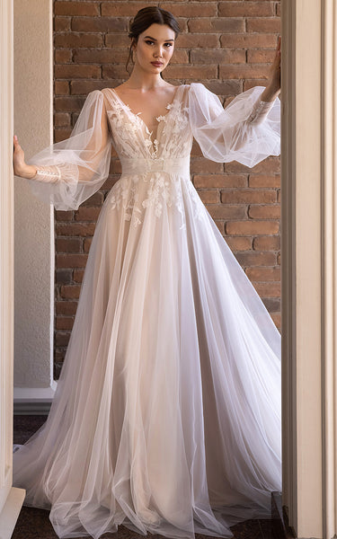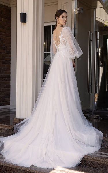 A-Line Casual V-neck Lace Wedding Dress With Deep-V Back And Appliques-716705
