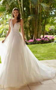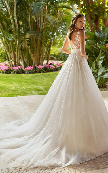 A-Line Elegant V-neck Lace Wedding Dress With Deep-V Back And Appliques-716730