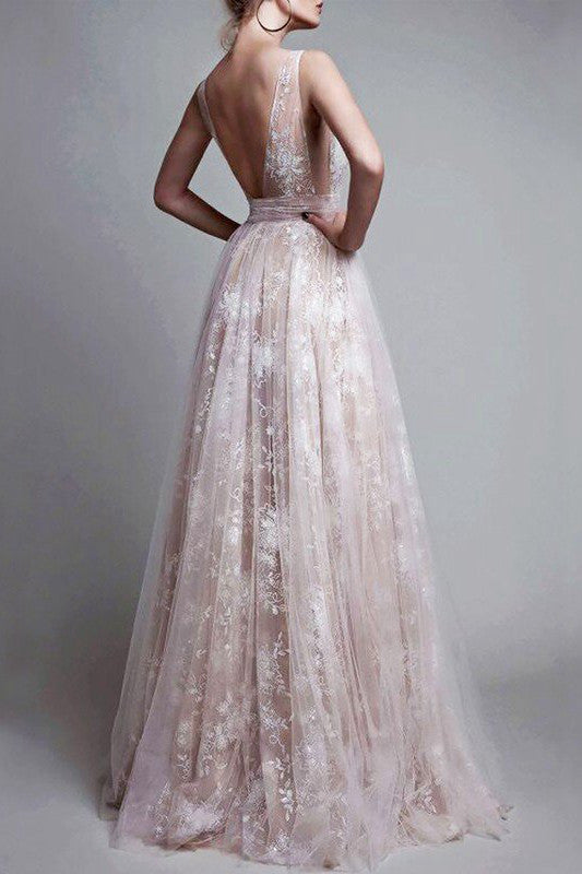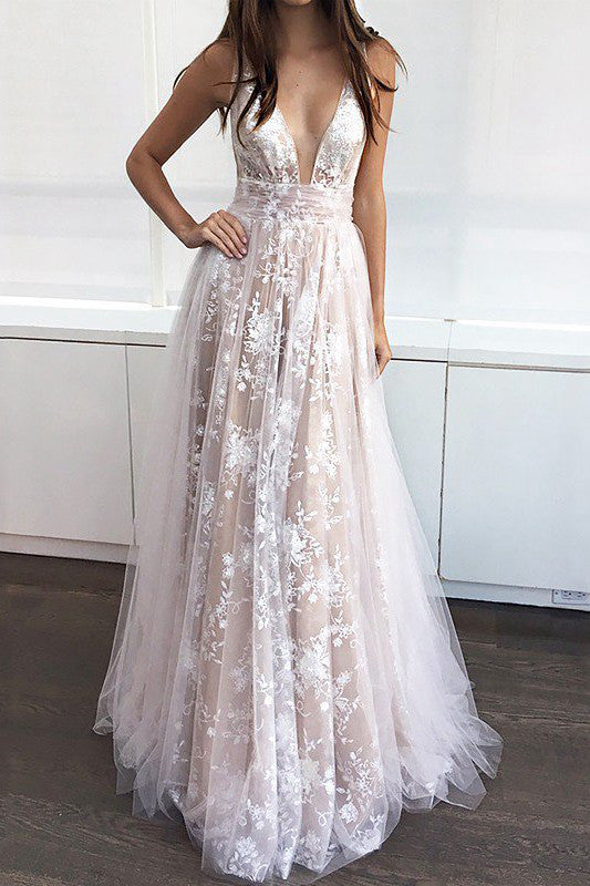 A-Line Lace Tulle V-neck Sleeveless Deep-V Back Prom Evening Dress-333870