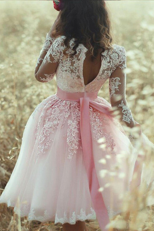 A-line Long Sleeve Lace V-neck Low-V Back Knee-length Homecoming Dress Prom-333972
