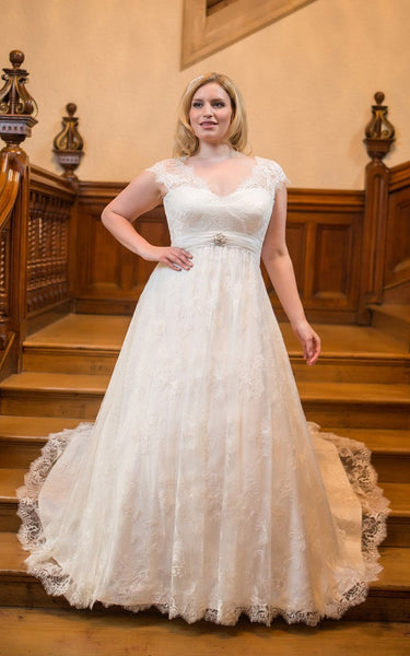 A-Line Long V-Neck Cap Empire Lace Brush Train Broach Dress-714691