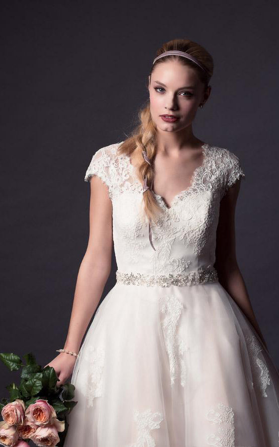 A-Line Mini V-Neck Bell Cap Appliques Button Tulle Lace Dress-713462