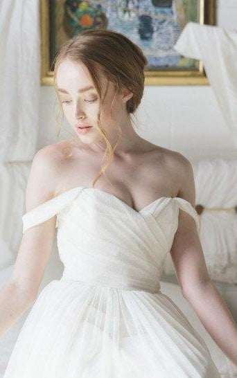 The A-line Off-the-shoulder Tulle Wedding Dress With Criss-cross Ruching-711805 is evocative, to say the least, but that's why you're drawn to it in the first place.