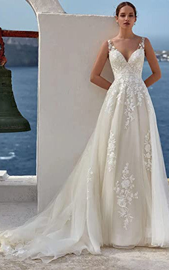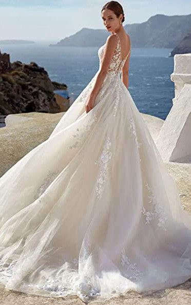 The A-Line Spaghetti Tulle Wedding Dress Casual Sexy Elegant Summer Adorable Beach With Deep-V Back And Sleevesless And Appliques-716791 is far and away, one of our most popular items. People can't seem to get enough of it.