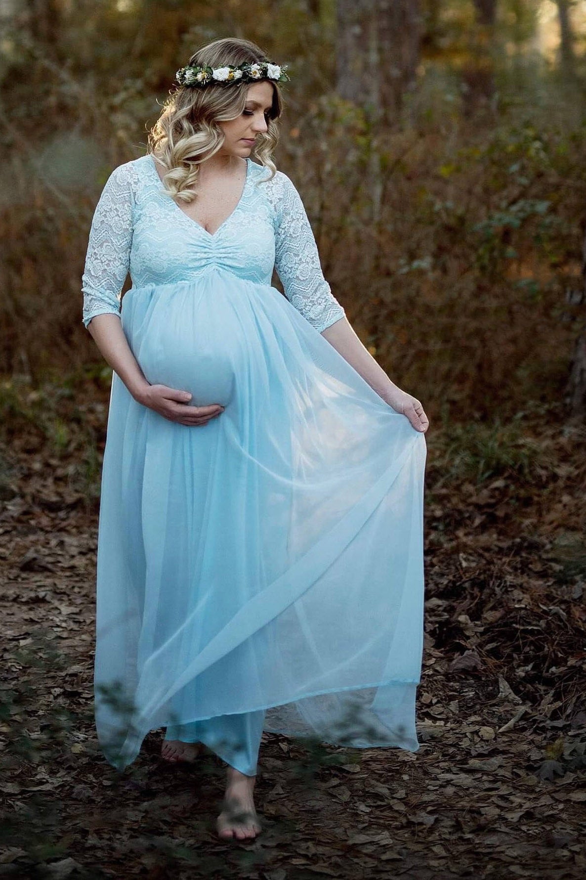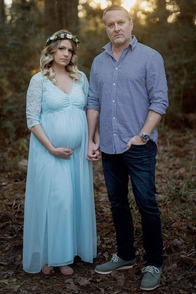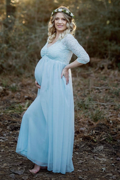 A-line V-neck Ruched Half Sleeve Floor-length Chiffon Lace Maternity Wedding Dress