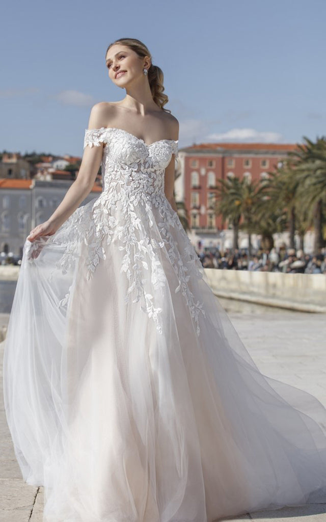 Life is too short to live without the Beach Floral Off-the-Shoulder A-Line Boho Lace Wedding Dress Princess Romantic Fairy Tulle Button Back Sweep Train Bridal Gown. Be happy. Be Content. Be Satisfied.