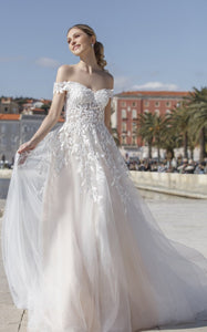 Beach Floral Off-the-Shoulder A-Line Boho Lace Wedding Dress Princess Romantic Fairy Tulle Button Back Sweep Train Bridal Gown