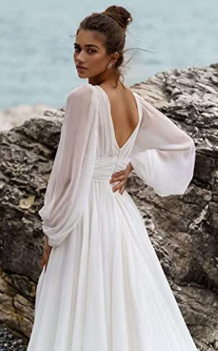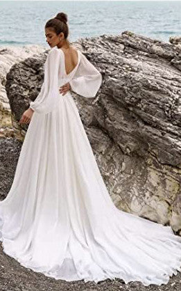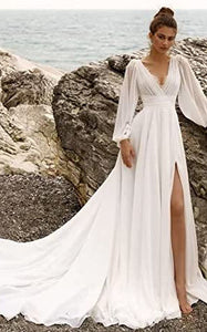 Beach Modest Elegant A-Line Split Front Wedding Dress Simple Casual Flowy Puff Long Sleeves V-Neck Bridal Gown with Train