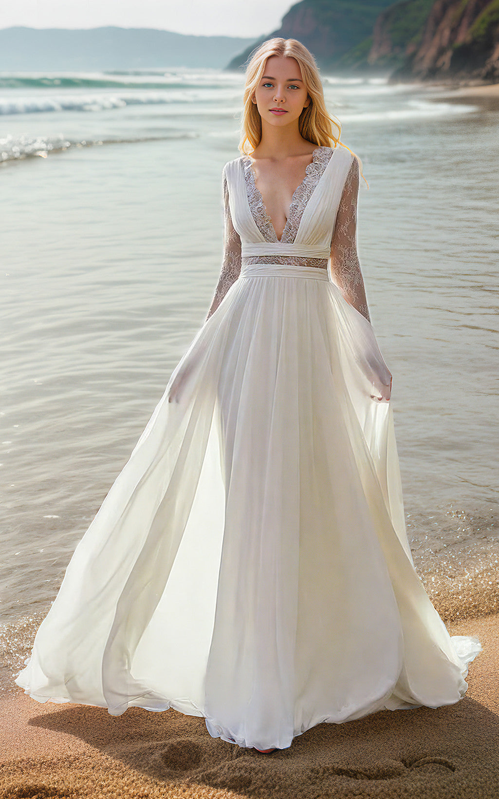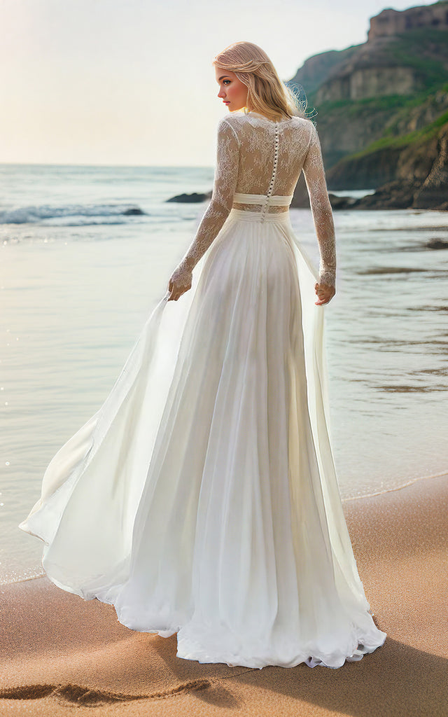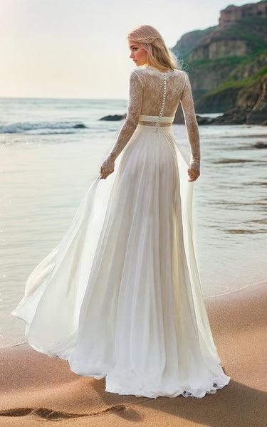 Beach Sexy Boho A-Line V-Neck Sleeved Wedding Dress Elopement Elegant Floral Chiffon Floor-Length Bridal Gown with Button Back