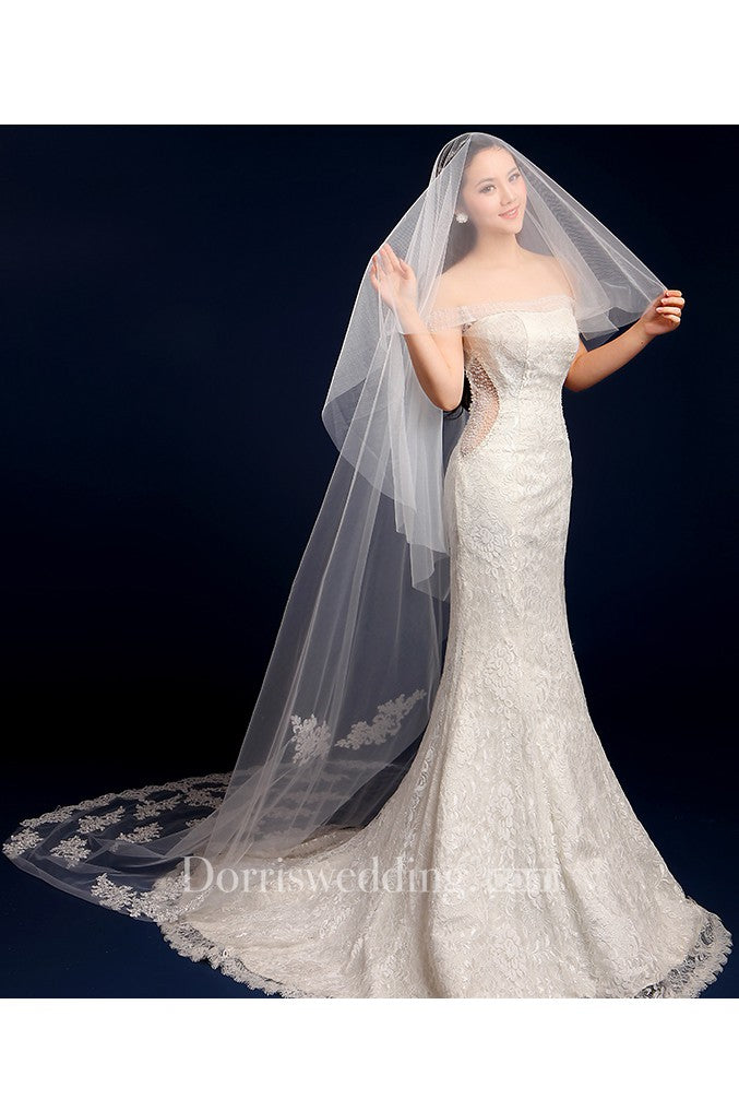 Beautiful Korean Cathedral Wedding Veil with Lace Edge and Appliques