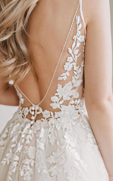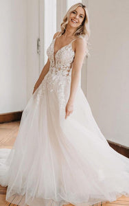 Imagine if you could be satisfied and content with your purchase. That can very much be your reality with the Bohemian Spaghetti V-neck A Line Ball Gown Floor-length Sleeveless Wedding Dress With Appliques-716024.