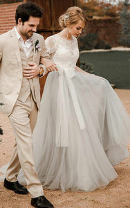 Bohemian Tulle A-Line Jewel Neckline Wedding Dress With Keyhole Back And Appliques-716554