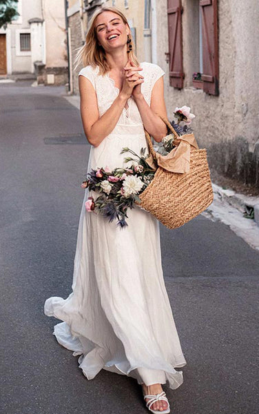 The Bohemian V-neck Chiffon Lace A Line Short Cap Sleeve V Back Wedding Dress with Sweep Train-715905 is the yin, to your yang. You've found what you're looking for.