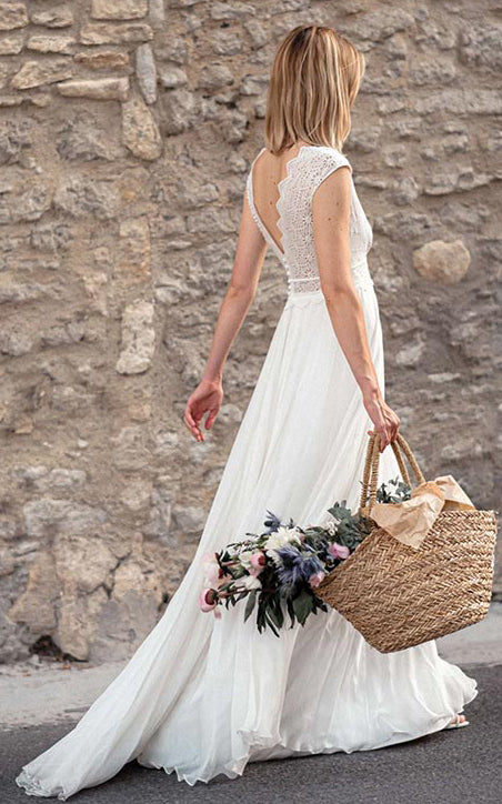 Bohemian V-neck Chiffon Lace A Line Short Cap Sleeve V Back Wedding Dress with Sweep Train-715905