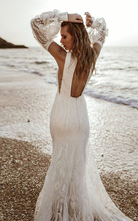 The Casual Lace Plunging Neckline Mermaid Wedding Dress With Long Sleeve And Open Back-716322 is far and away, one of our most popular items. People can't seem to get enough of it.