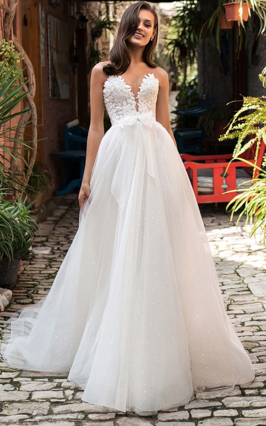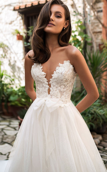 Elegant A Line Ball Gown Sweetheart Lace Tulle Court Train Wedding Dress with Appliques and Bow