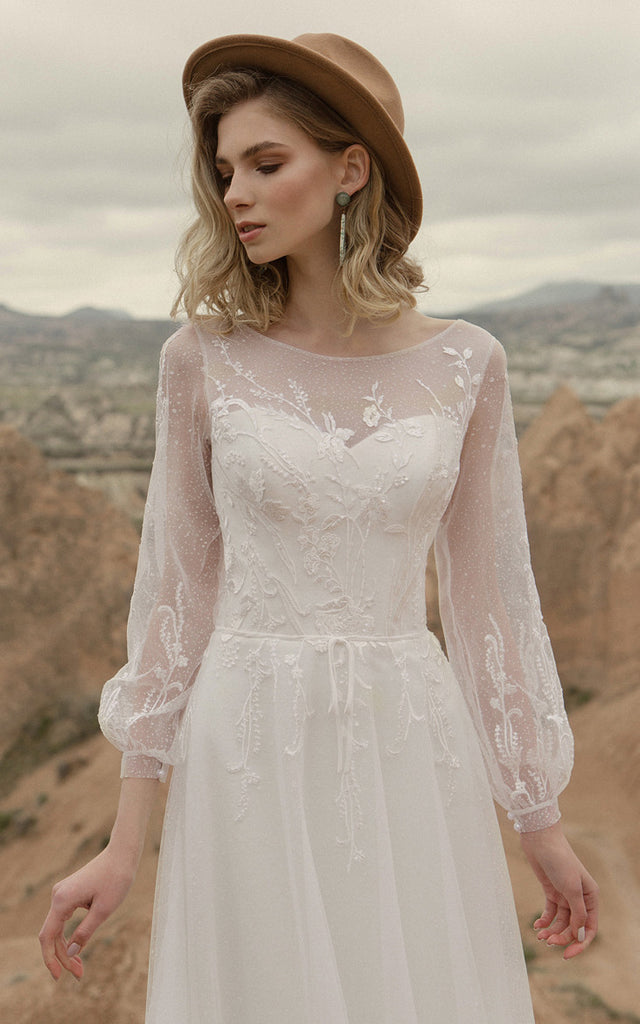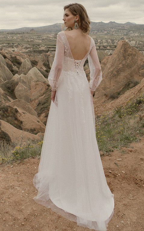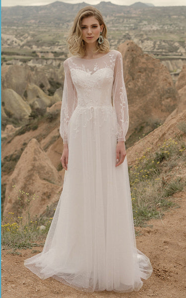 Elegant A-Line Bateau Wedding Dress With Illusion Long Sleeves And Lace-up Back-716441