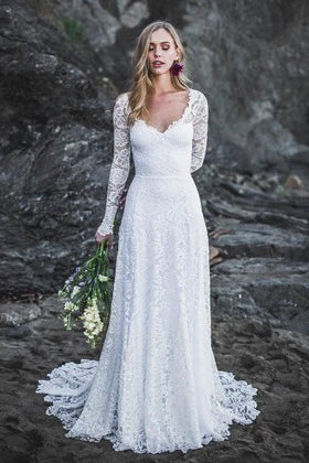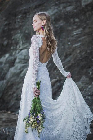 Elegant A-Line Lace Long Sleeve Wedding Gown With V-Neck And Keyhole Back