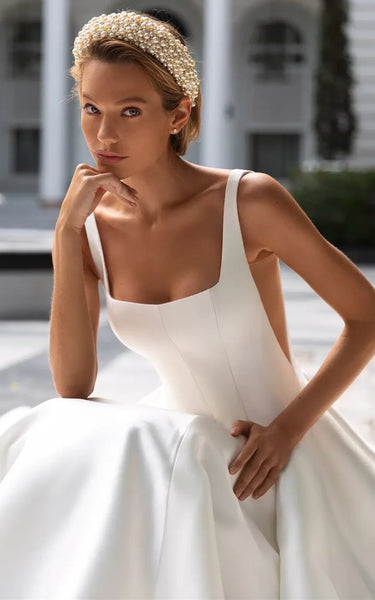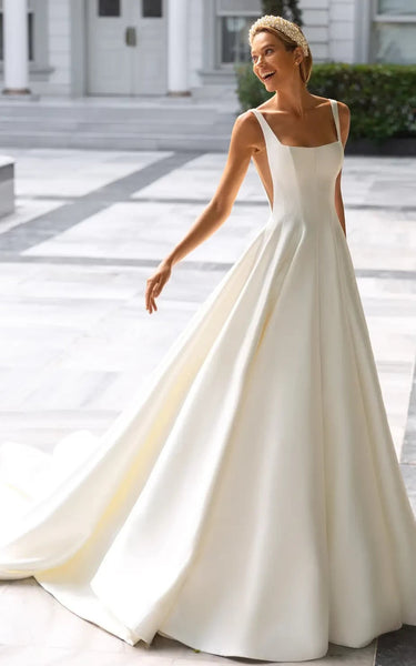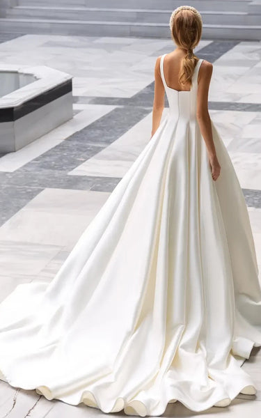 Elegant A Line Square Neck Satin Court Train Wedding Dress-716389