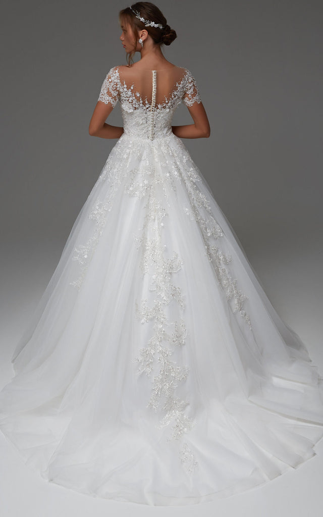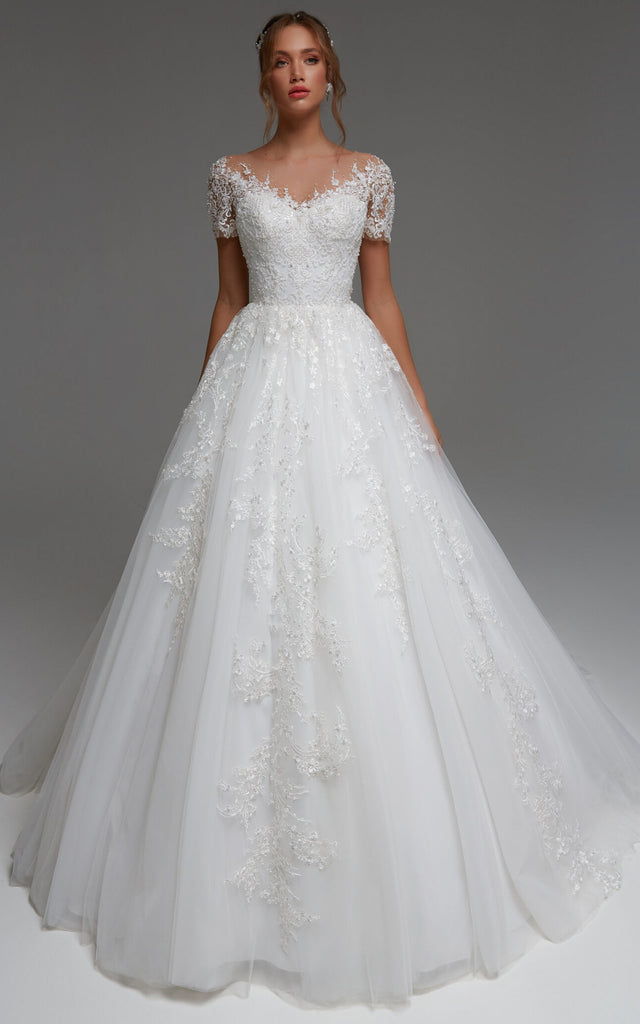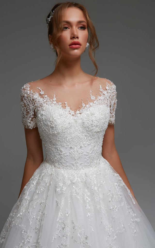 The Elegant Bateau Short Sleeve Sweep Train Floor-Length A Line Ball Gown Wedding Dress With Appliques-716173 is far and away, one of our most popular items. People can't seem to get enough of it.