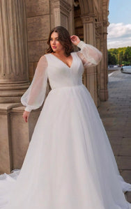 Elegant Minimalist Plus Size Long Sleeves Wedding Dress Modest Casual A-Line V-Neck Tulle Bridal Gown