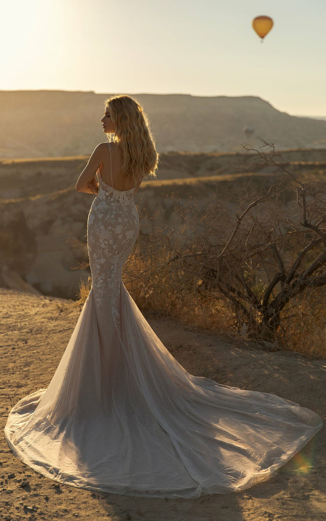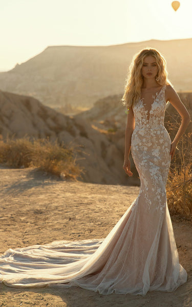 The Elopement Floral Boho Mermaid Lace Fitted Wedding Dress Sexy Beach Forest Country Plunging Backless Bridal Gown with Appliques destined to impress, and priced at only $249.69, for a limited time.