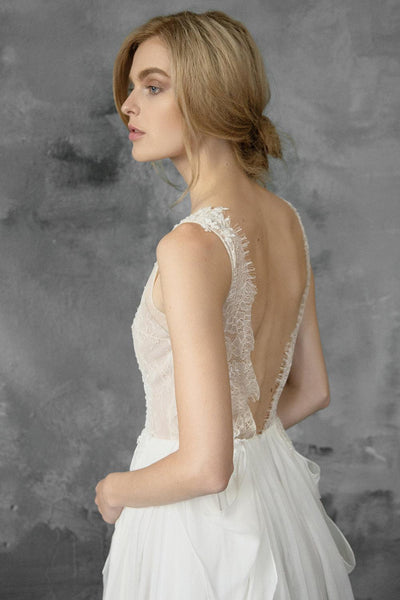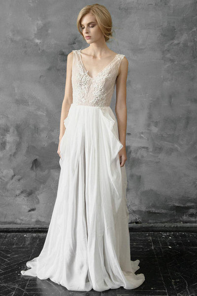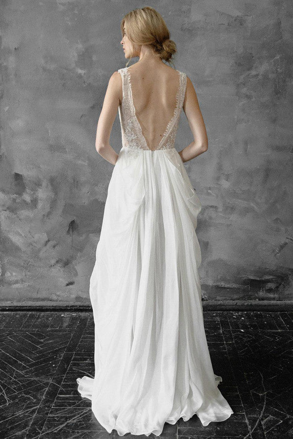 Ethereal Floral A-Line Boho Lace Wedding Dress Flowy Sexy Beach Garden Sleeveless Low Back Appliqued Bridal Gown with Ruffles