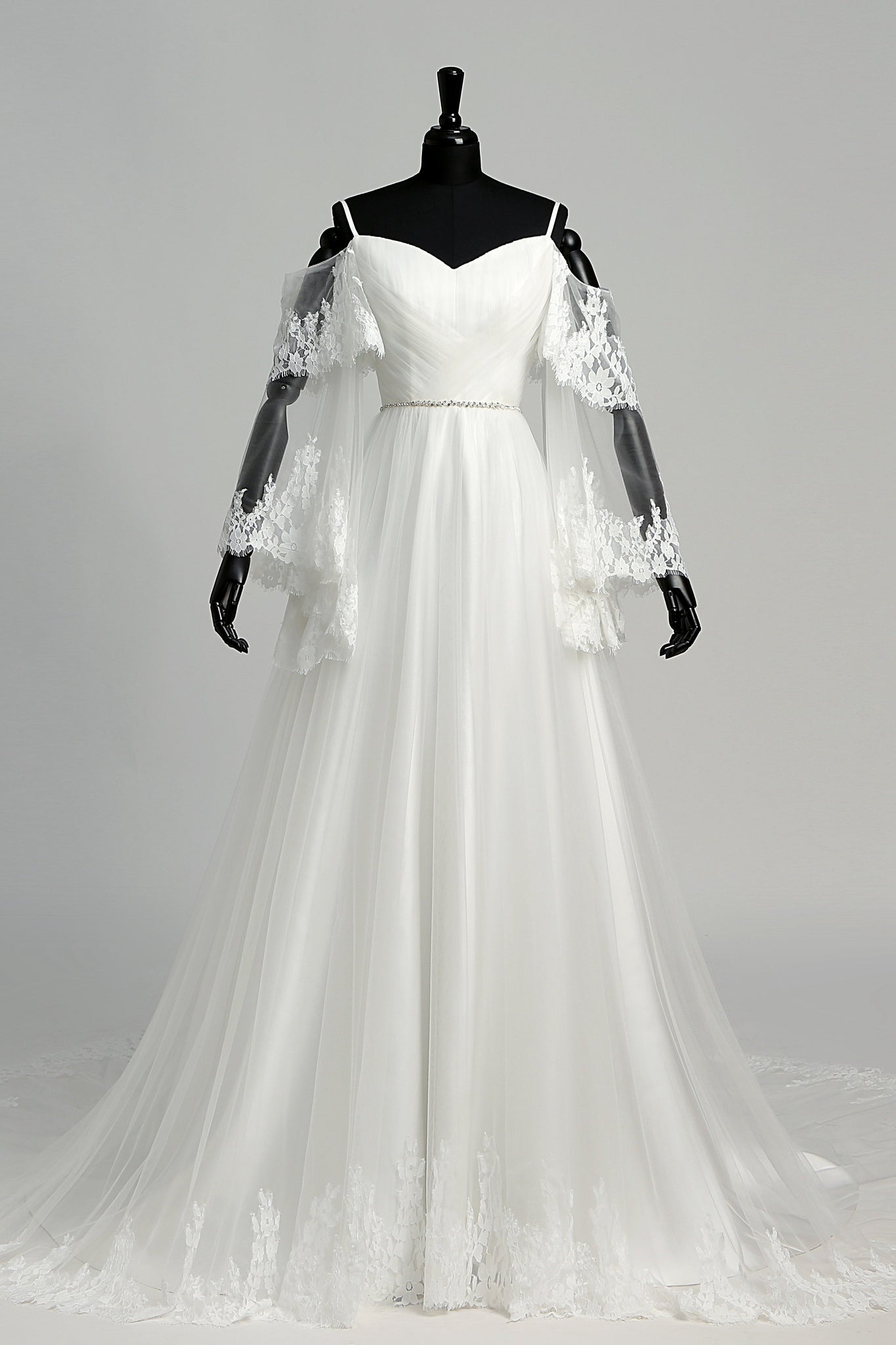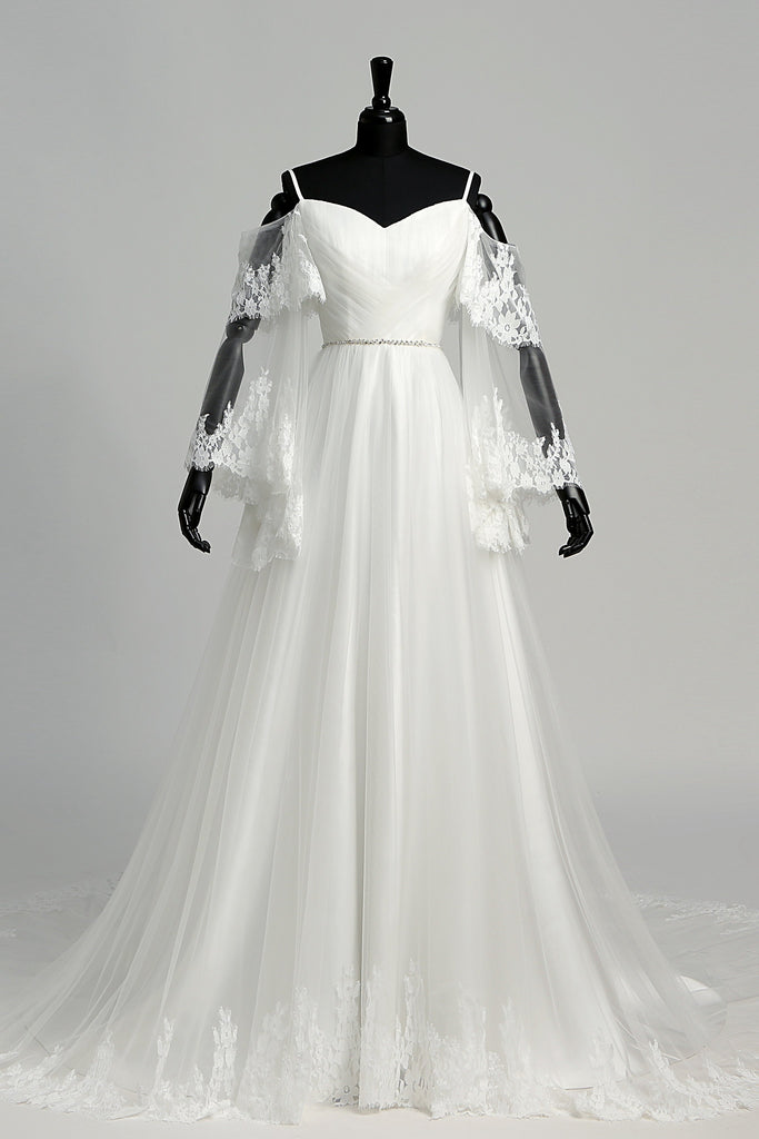 Life is too short to live without the Floor-length Court Train A-line Off-the-shoulder Bell Illusion Long Sleeve Low-V Back Tulle Weeding Dress. Be happy. Be Content. Be Satisfied.