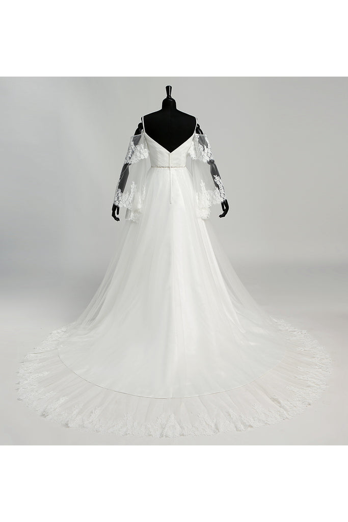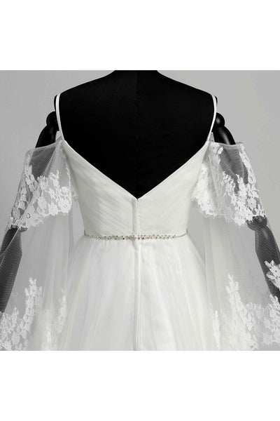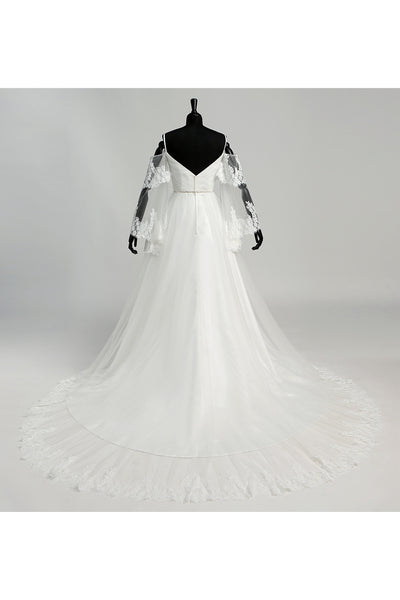 Floor-length Court Train A-line Off-the-shoulder Bell Illusion Long Sleeve Low-V Back Tulle Weeding Dress