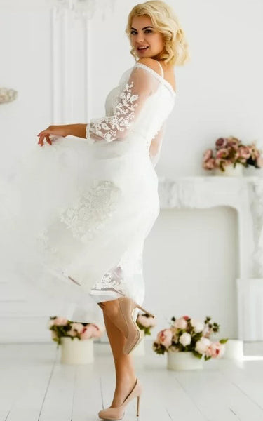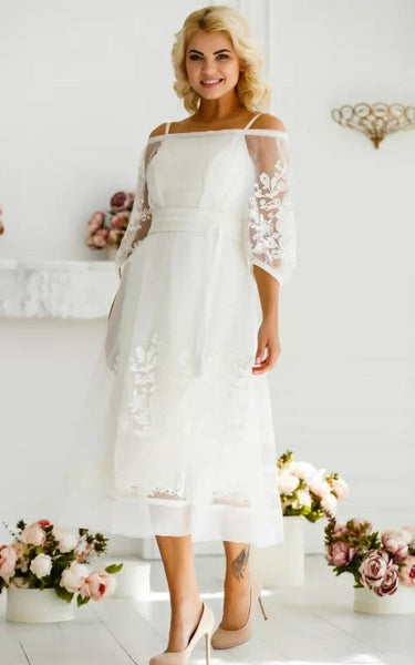 The Floral Boho Lace A-Line Off-the-Shoulder Dress for Wedding Vintage Modest Tea-Length 3/4 Length Sleeve Bridal Gown destined to impress, and priced at only $164.69, for a limited time.