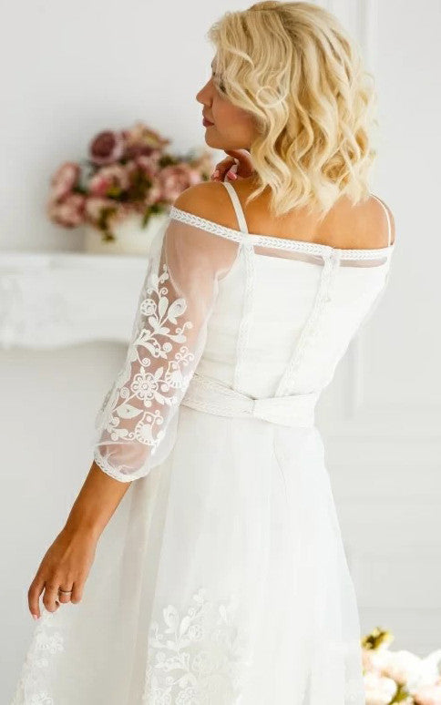 Floral Boho Lace A-Line Off-the-Shoulder Dress for Wedding Vintage Modest Tea-Length 3/4 Length Sleeve Bridal Gown