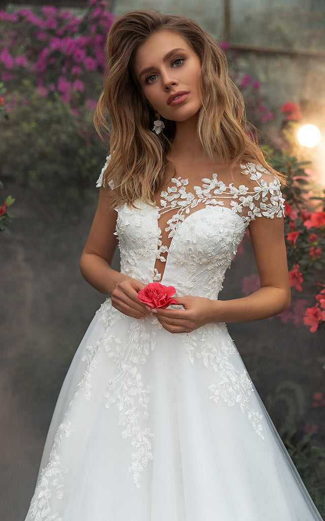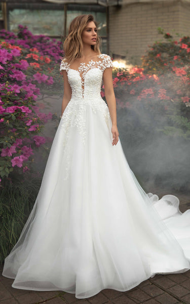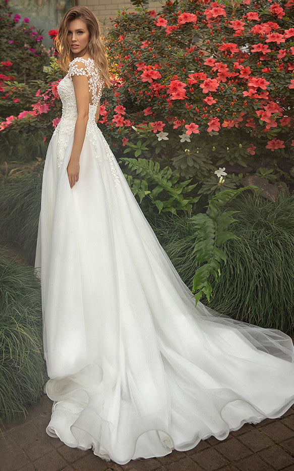 The Floral Elegant A-Line Boho Lace Tulle Ball Gown Wedding Dress Formal Princess Plunging Court Train Evening Party Gown with Button Back destined to impress, and priced at only $283.89, for a limited time.