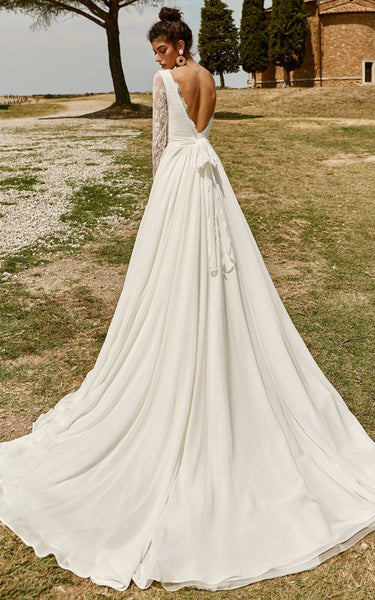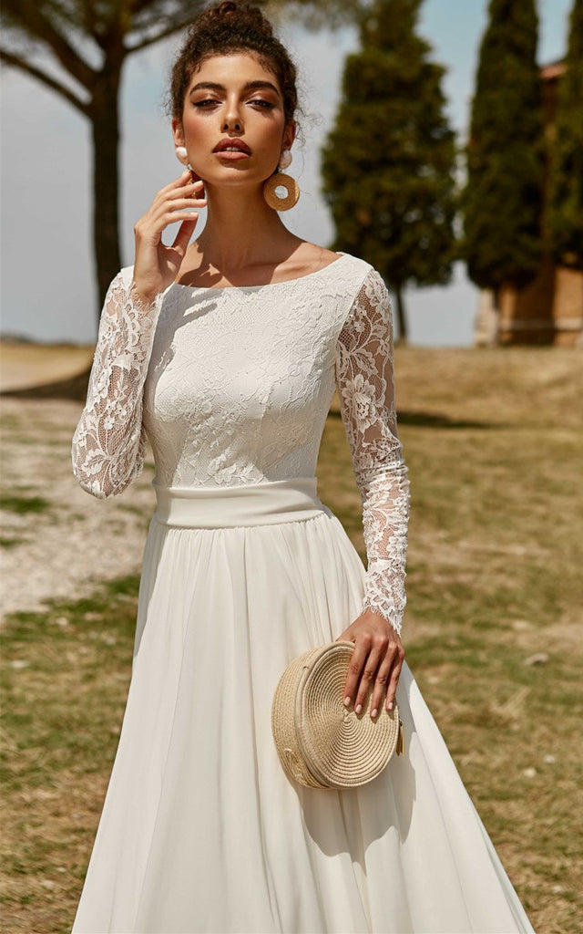 Floral Modest A-Line Ball Gown Wedding Dress Elegant Western Illusion Long Sleeves Bateau Neckline Deep-V Back Bridal Gown