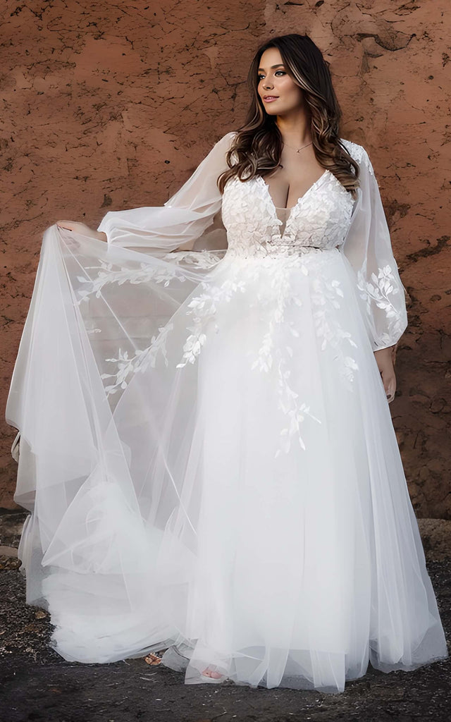 Floral Plus Size Sweep Train A-Line Long Sleeves Plunging Wedding Dress with and Appliques
