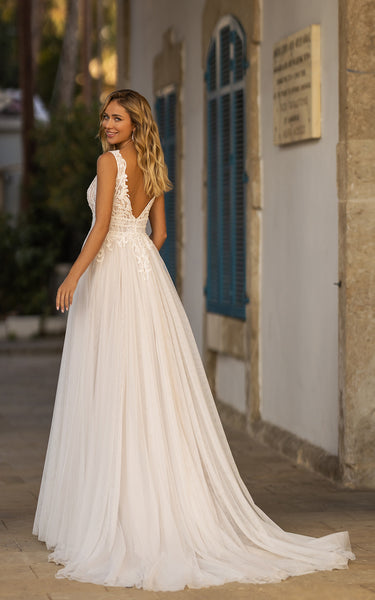 Floral Romantic Elegant A-Line Boho Lace Wedding Dress V-Neck Sleeveless Deep V-Back Bridal Gown with Brush Train
