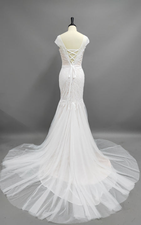 Gossamery Cap-Sleeve Illusion Tulle Wedding Dress With Lace And Court Train-715165