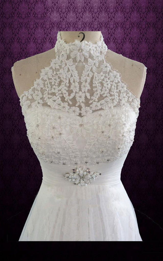 Halter Sleeveless Lace Weddig Dress With Beading And Pleats-710974